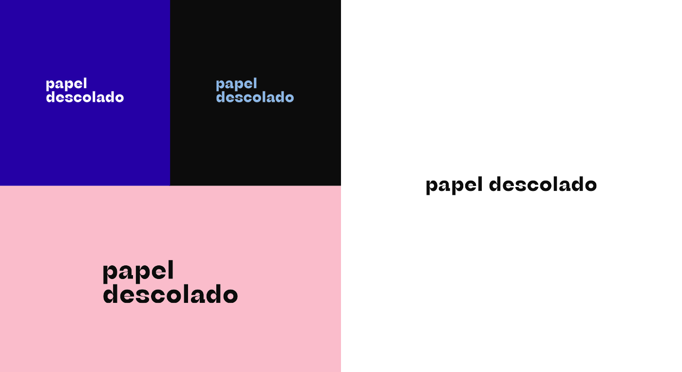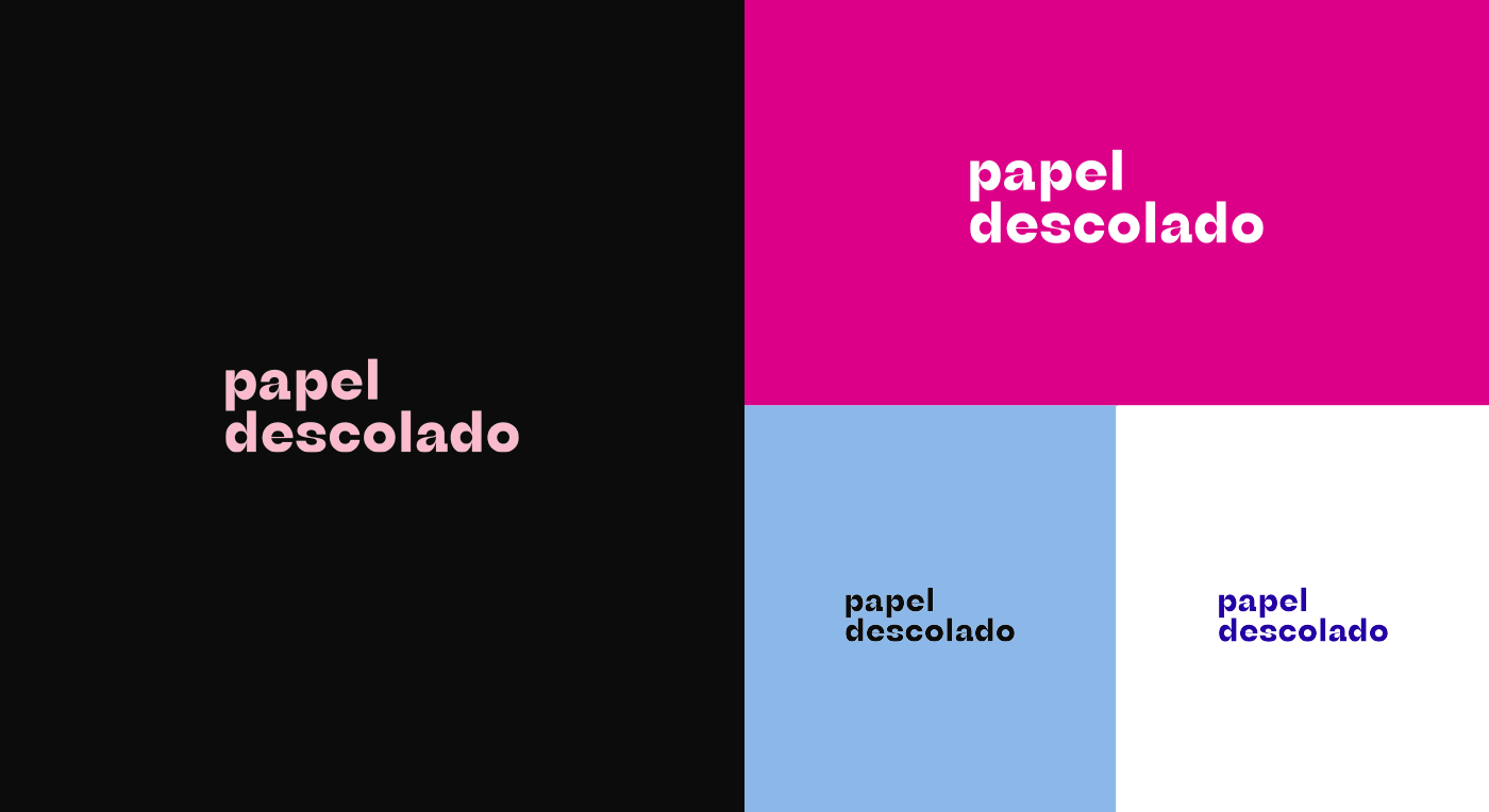 A Papel Descolado é também inclusiva, mente aberta e versátil. Devido a isso, a escolha da escrita em caixa baixa (letras minúsculas) foi fundamental. Esta é a versão de uso preferencial, alinhada à esquerda. A posição das palavras foi escolhida para destacar ainda mais a Papel Descolado de seus concorrentes. O logotipo pode ser usado com todas as cores da paleta: rosa, azul, preto, branco, rosa claro e azul claro.