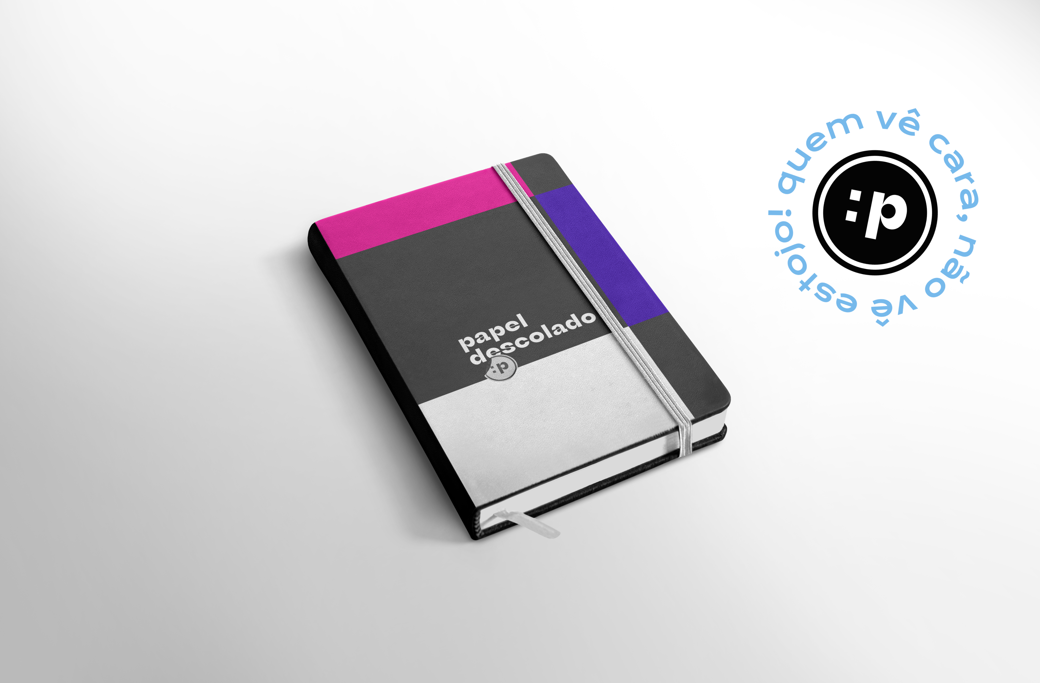A Papel Descolado agora tem três assinaturas visuais. Carrega tanto versões do logo, quanto o slogan e o símbolo. Nesta primeira, a aplicação do símbolo é permitida de todas as maneiras, desde que esteja dentro das limitações ao seu redor.