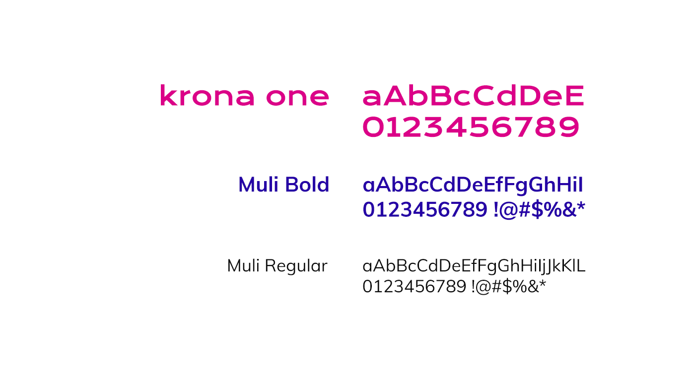 Com o toque criativo e rebelde, os títulos receberam Krona One, uma fonte sem serifa e de peso regular único. Para o corpo do texto, a selecionada foi Muli, fonte que transmite o sentido humano, confiável e moderno. Também não é serifada, porém pode ser utilizada em seus mais variados pesos (de ExtraLight a Black Italic). Em textos corridos é indicado o uso do peso Light, pois possui legibilidade adequada. Nos tópicos e subtítulos recomenda-se pesos a partir de SemiBold.